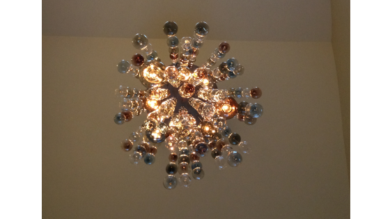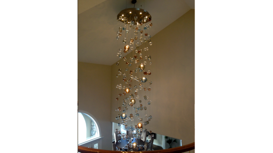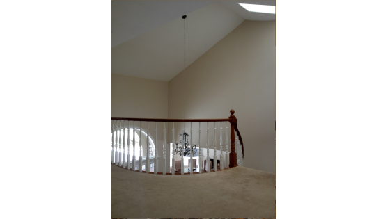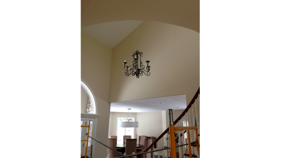 You can see in the first few shots of this entry that it is a combination of a high ceiling and an open railing staircase, leaving us with a cold, vast area.  In order to make this space more intimate we need to fill it.  The easiest rule of thumb to find the correct size fixture is to measure the width and length of the room in feet and then convert the sum of the two numbers to inches. This dictates the minimum diameter of your light fixture.  The entry featured in the picture was 16’x14’, so we needed at least a 30” diameter fixture.  The height of the fixture is determined not only by your ceiling height, but also the scenery you are trying to create.  This particular ceiling is 22’ high.  We wanted to draw the eye up, so we went with a very tall fixture of 11’H x 3’W.  Injunction with the sloped ceiling we dropped our canopy 12” from the ceiling allowing it to hang true.  This brought our fixture to about 10’ off the floor, giving us enough room to walk underneath it without feeling crowded.